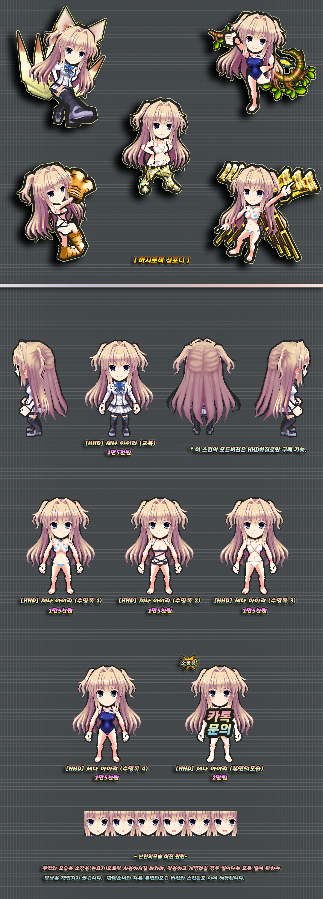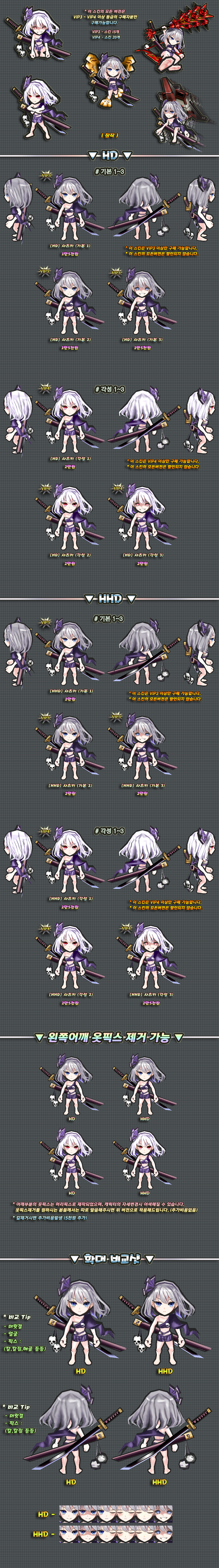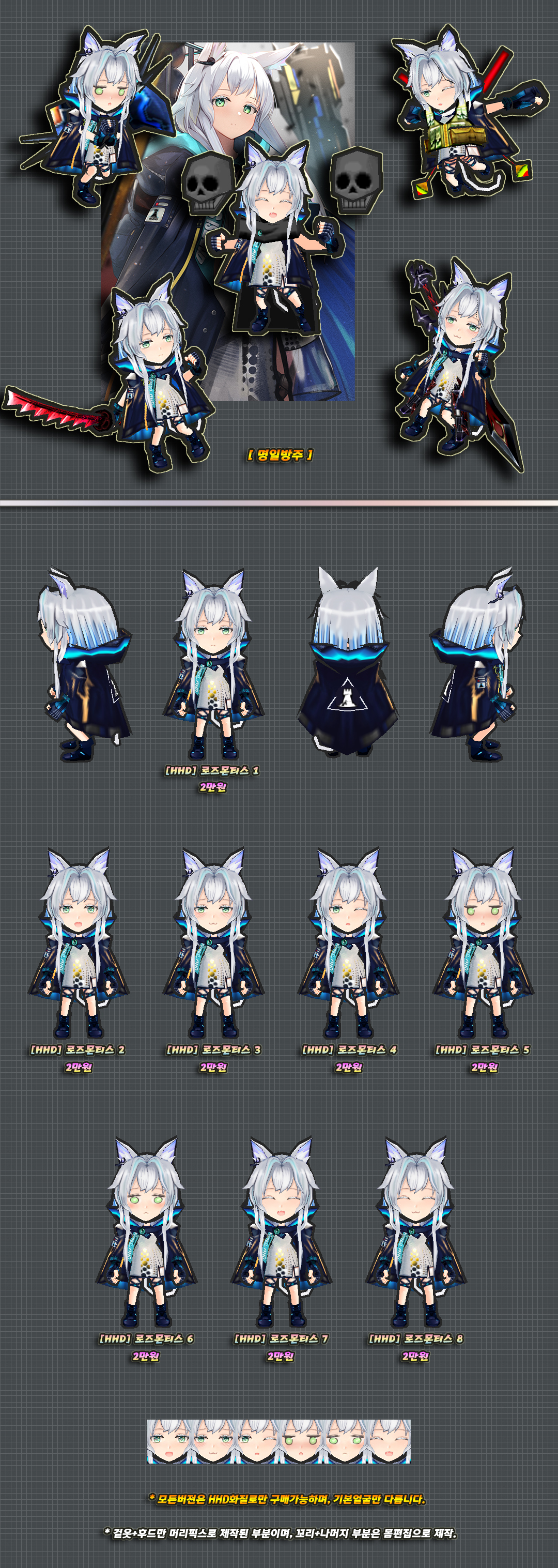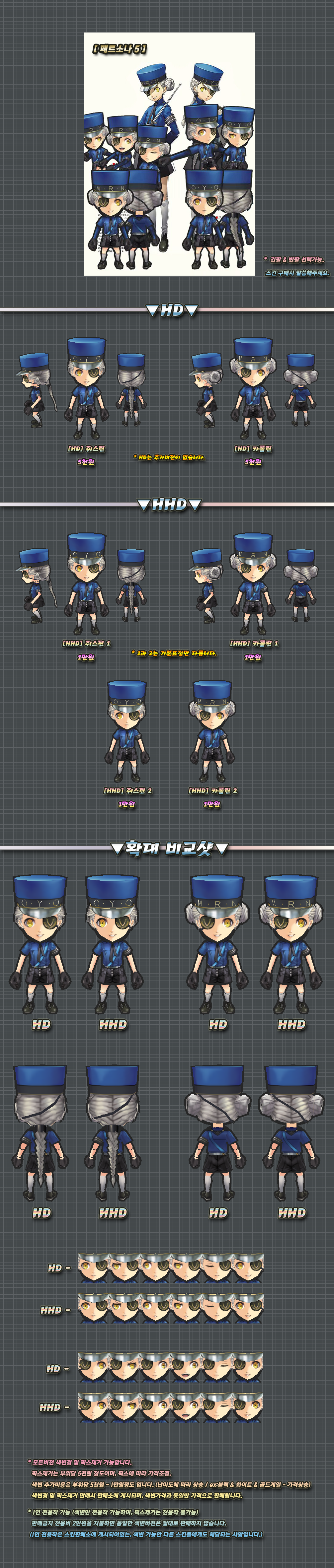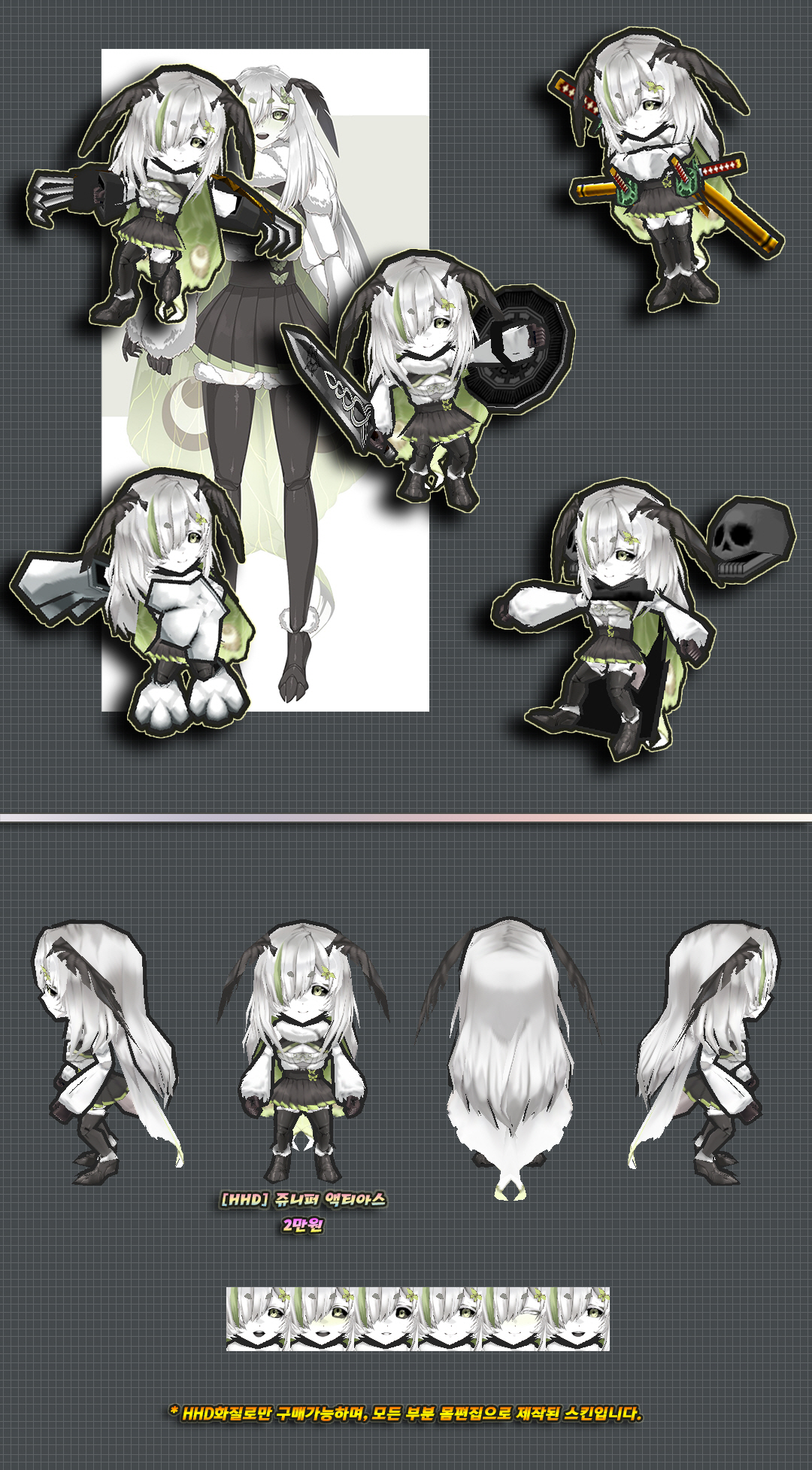 이 스킨의 하의 천부분은 머리픽스로 제작된 부분이며 자세변경시 위치가 어색해질 수 있습니다.