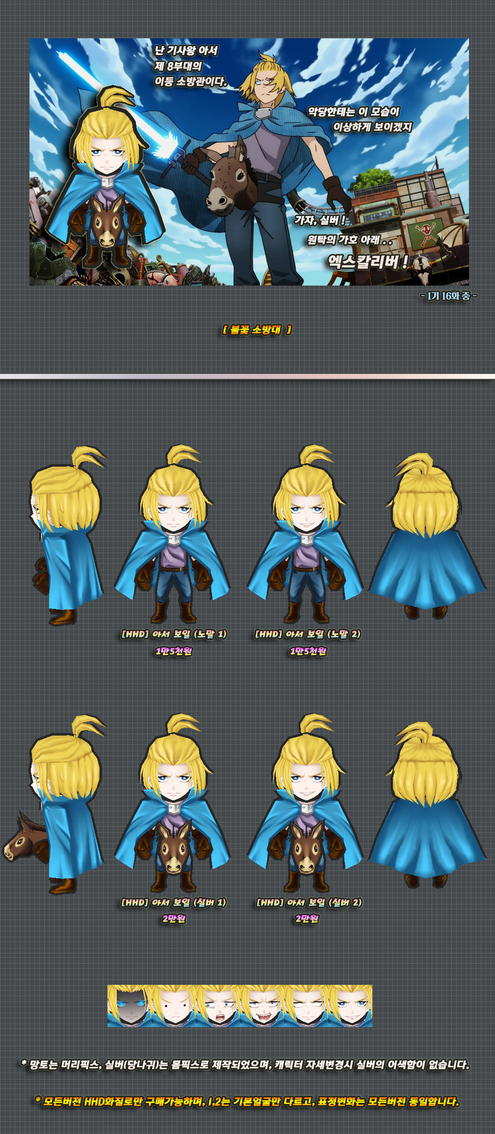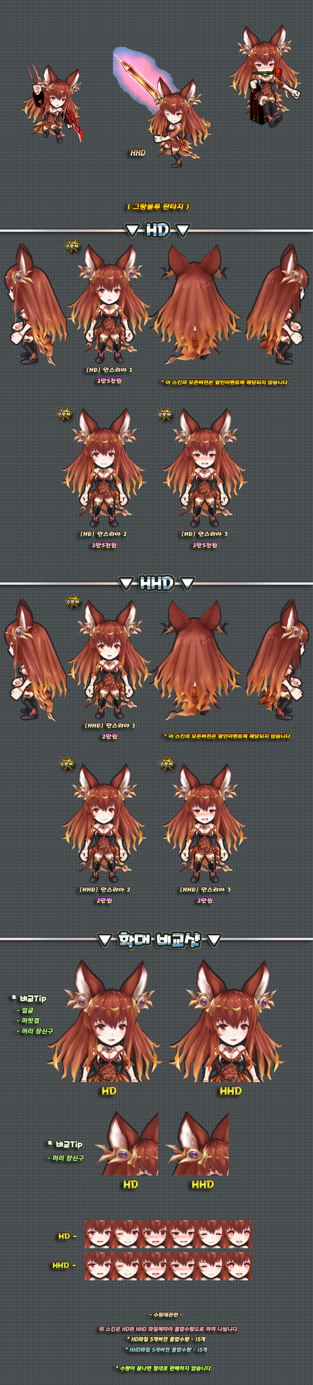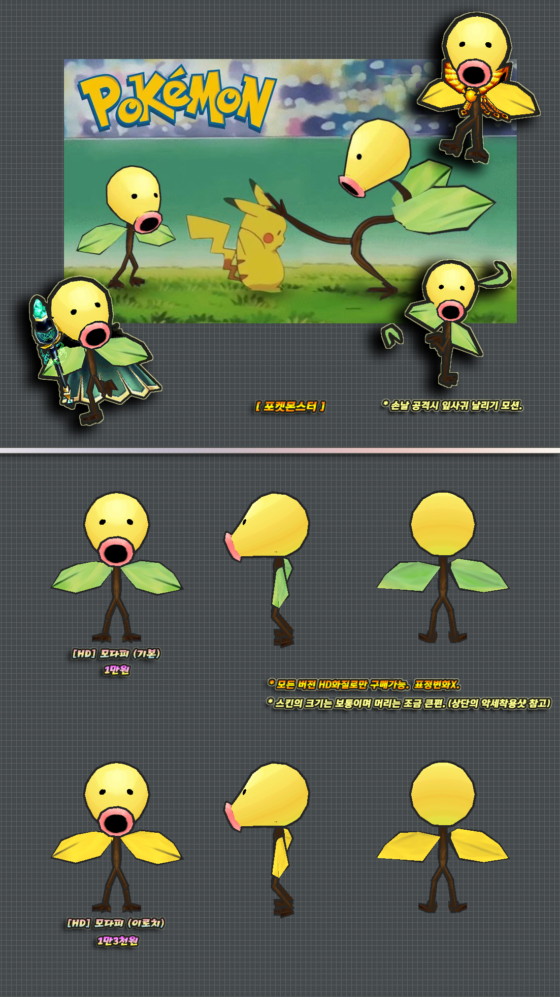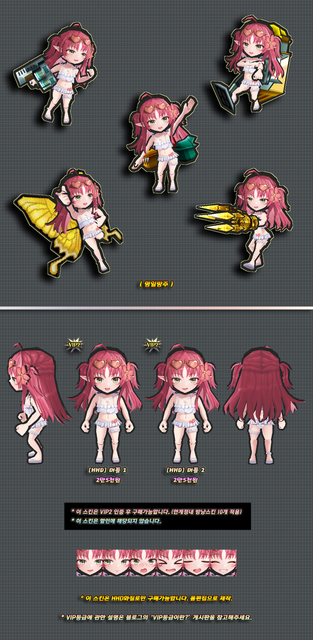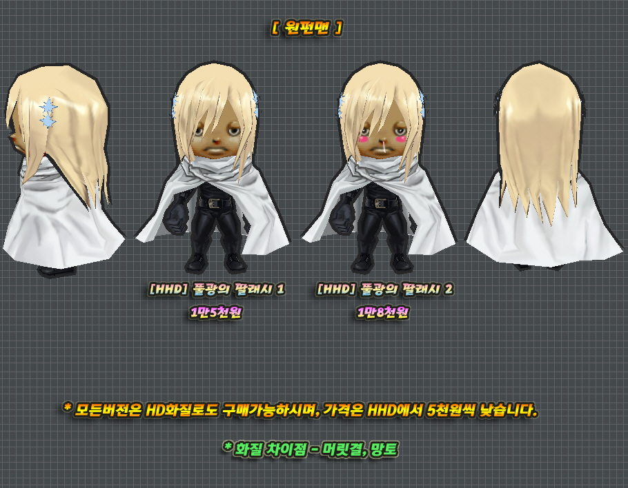 이 스킨의 하의 천부분은 머리픽스로 제작된 부분이며 자세변경시 위치가 어색해질 수 있습니다.