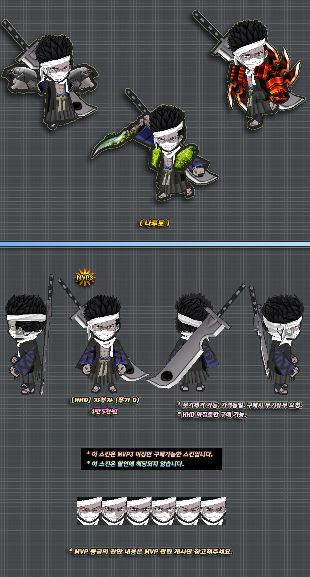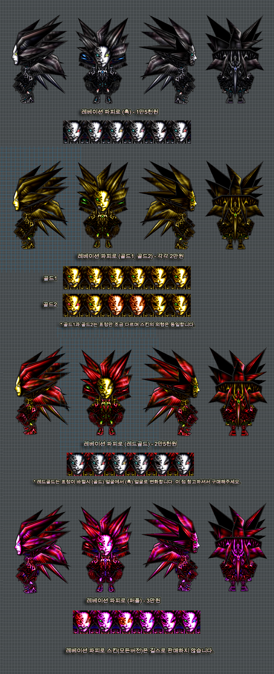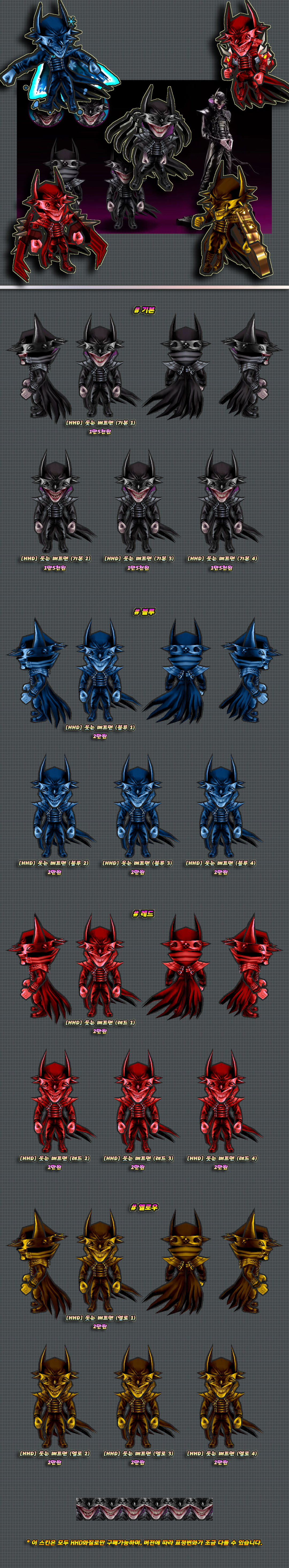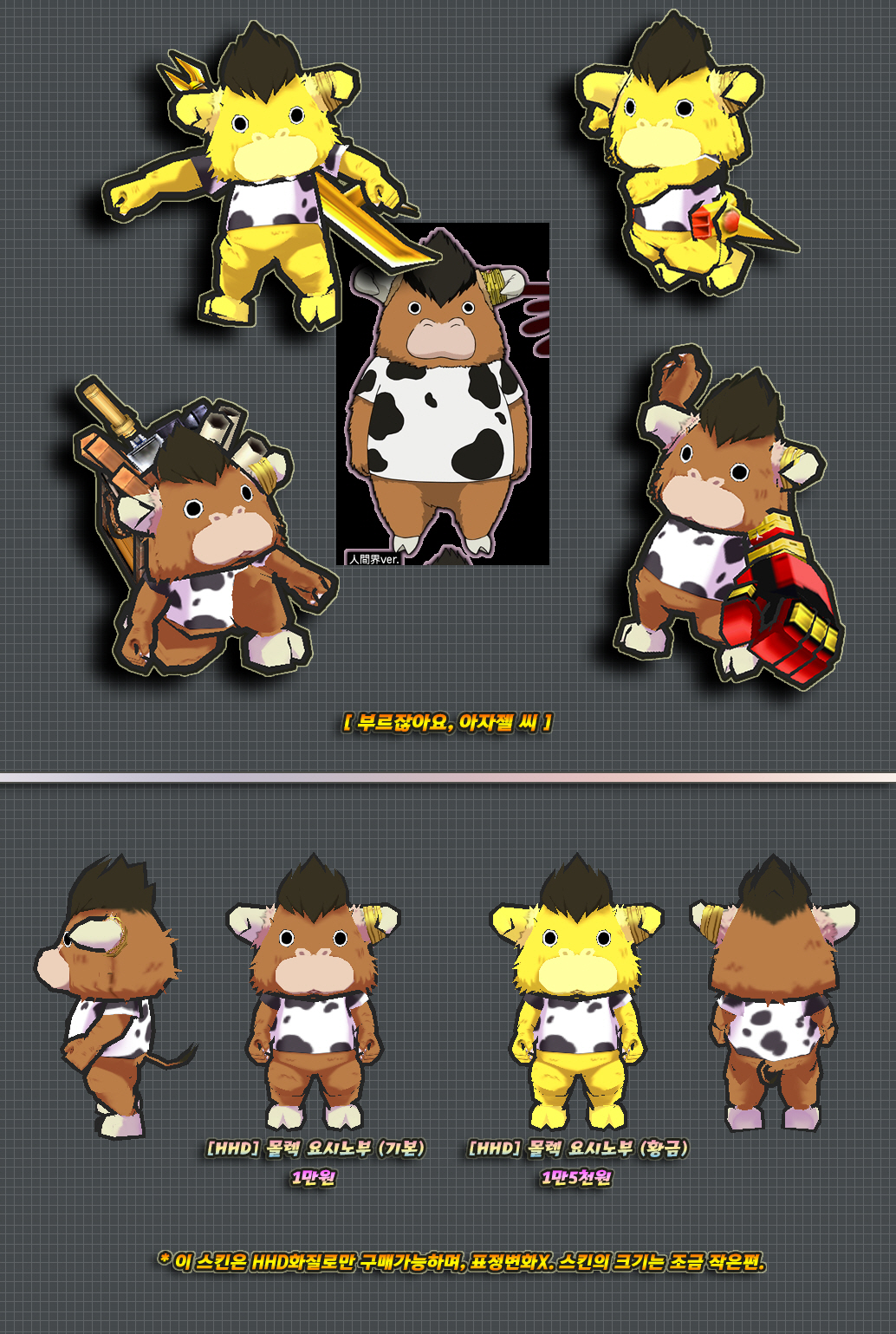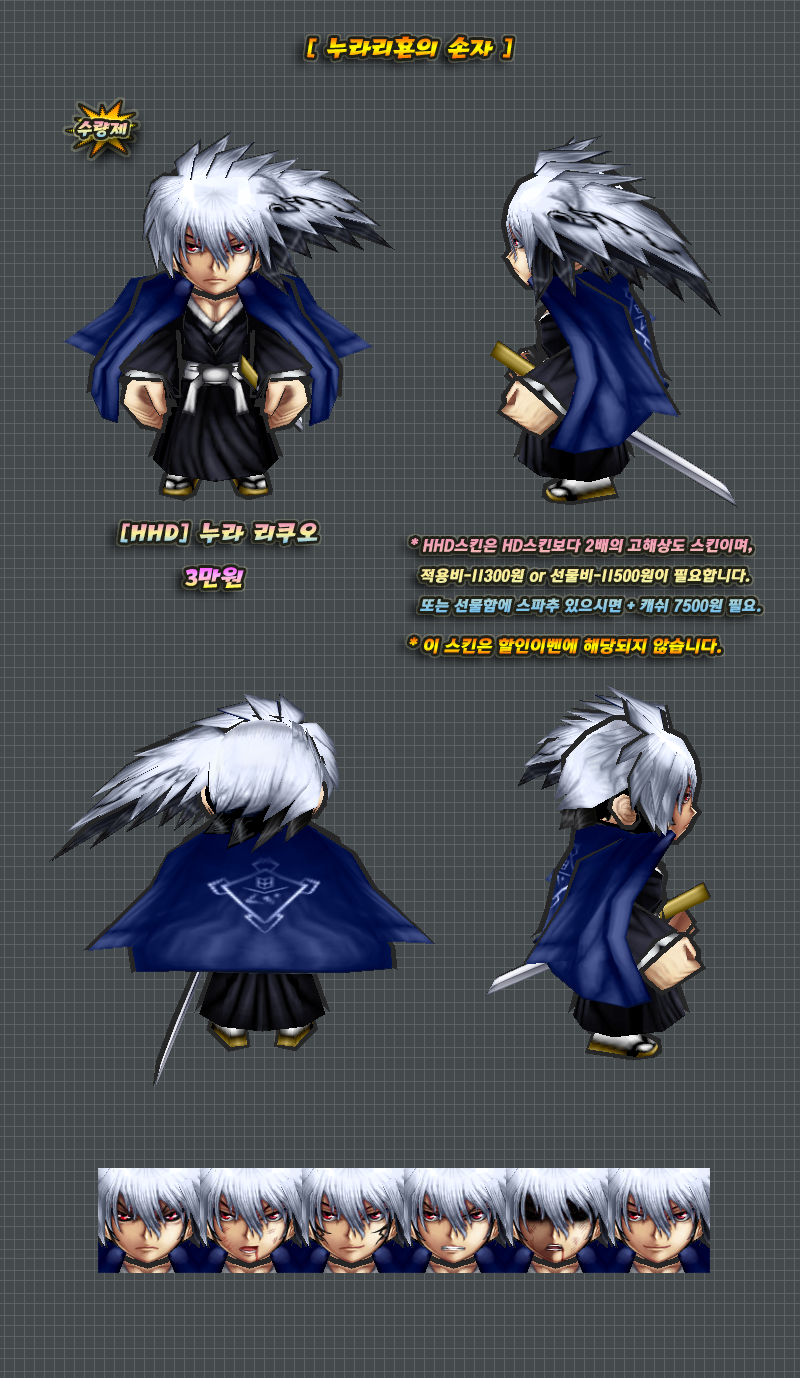 본연의모습 버전은 소장용(눈요기)으로만 사용하시길 바라며, 착용하고 게임했을 경우 일어나는 모든 일에 관하여 방냥은 책임지지 않습니다. 판매소내의 다른 본연의 모습 버전의 스킨들도 이에 해당됩니다.