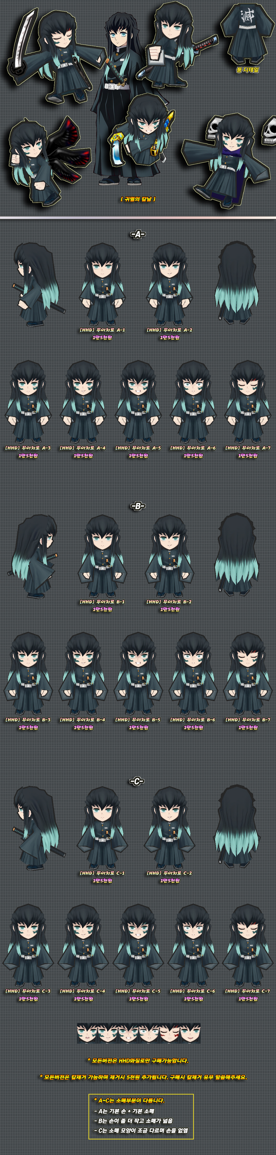 소매가 달린버전은 소매가 머리픽스로 제작되었기에 캐릭의 자세가 변경되면 소매만 공중에 따로 둥둥 떠다닐 수 있습니다. 웬만하면 제거버전으로 구매하시길 추천드리고 있습니다. 이 주의사항을 읽음에도 불구하고 개인적인 고집으로 인해, 소매달린버전으로 구매하여 후회하시더라도 제거버전으로 덮어드리지 않습니다.