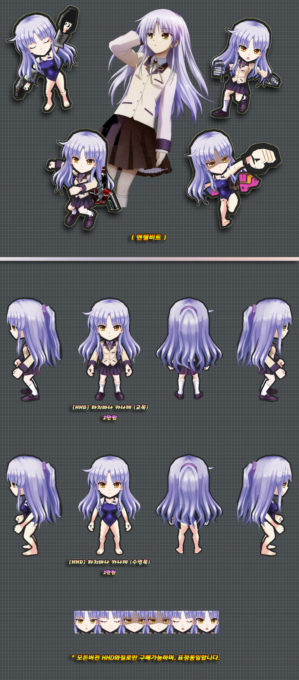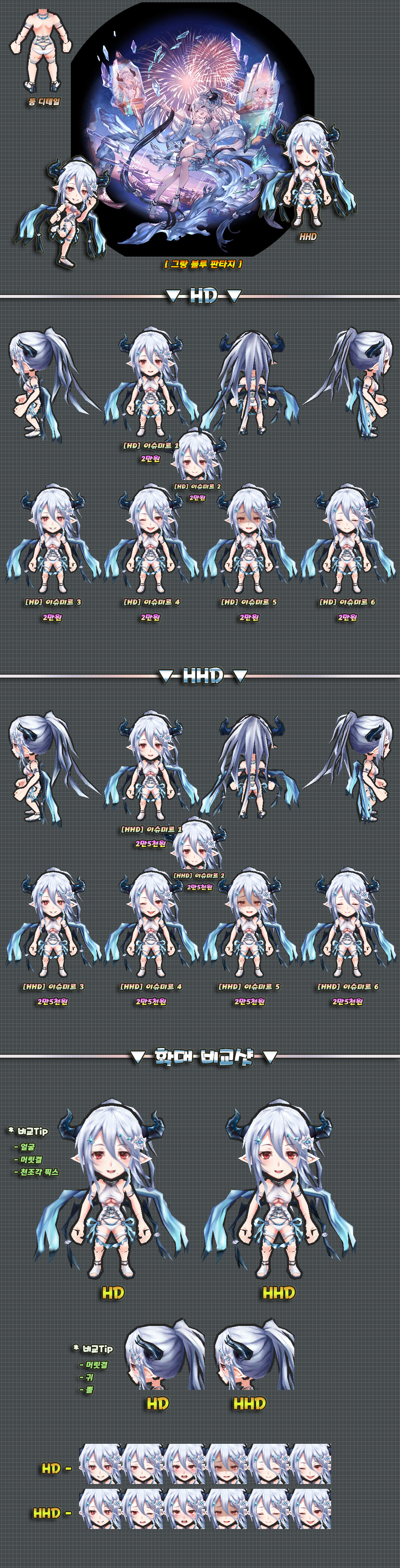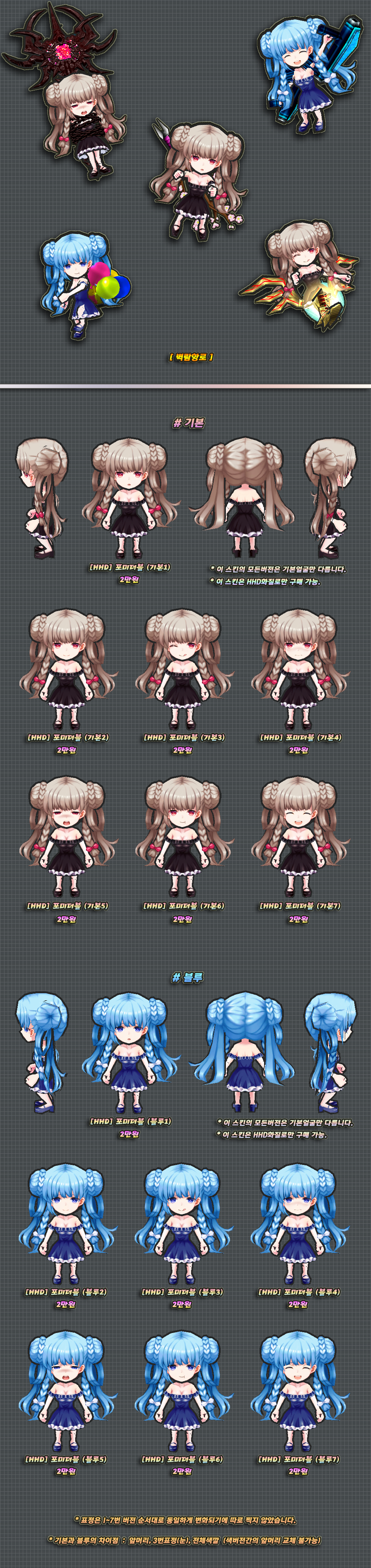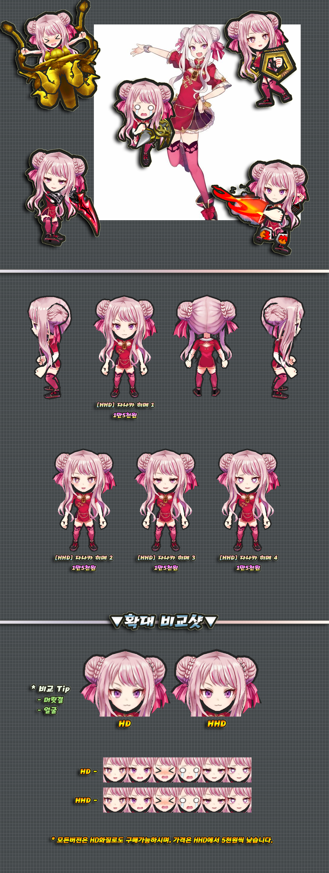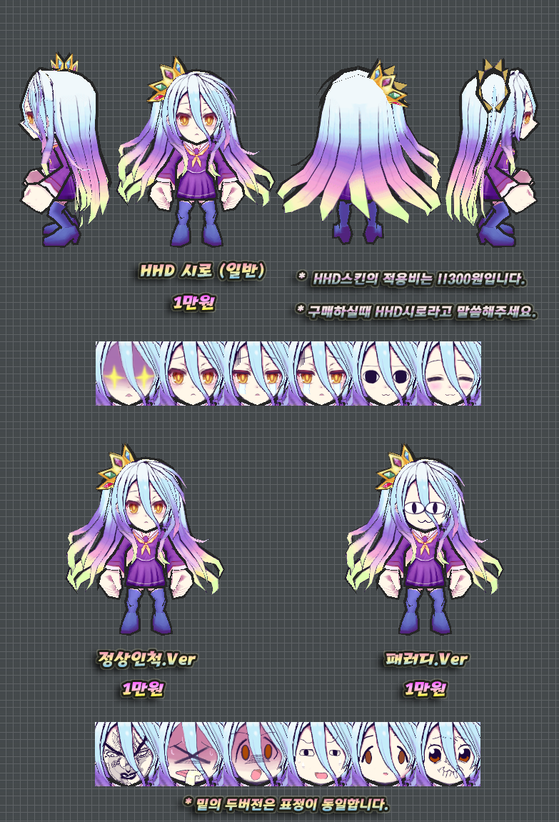 위 스킨은 HHD화질로만 구매가능하며, 판매소내의 HHD로만 게시되었지만 화질선택의 언급이 없는 다른 스킨들도 HHD화질로만 구매 가능합니다.