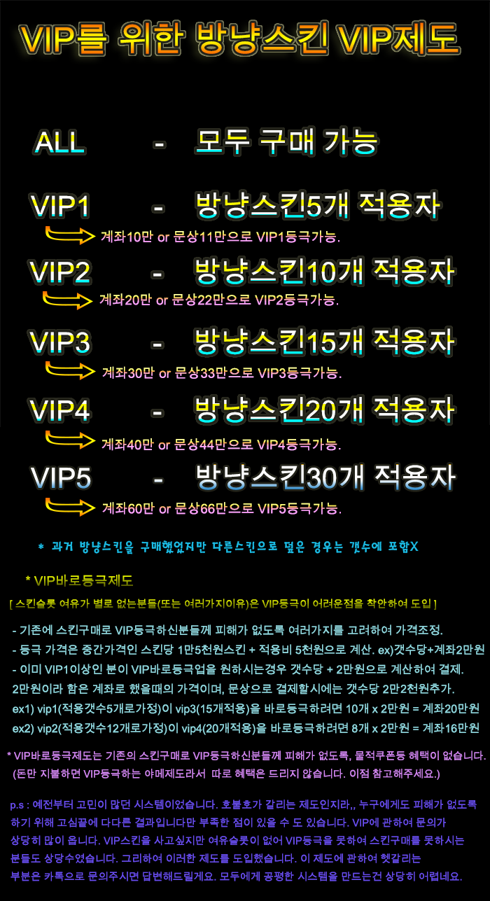 * VIP 스킨 구매의 불편한 점을 개선한 계정 공유 시스템에 대한 설명은 'VIP 링크 시스템' 게시판 참고해주세요