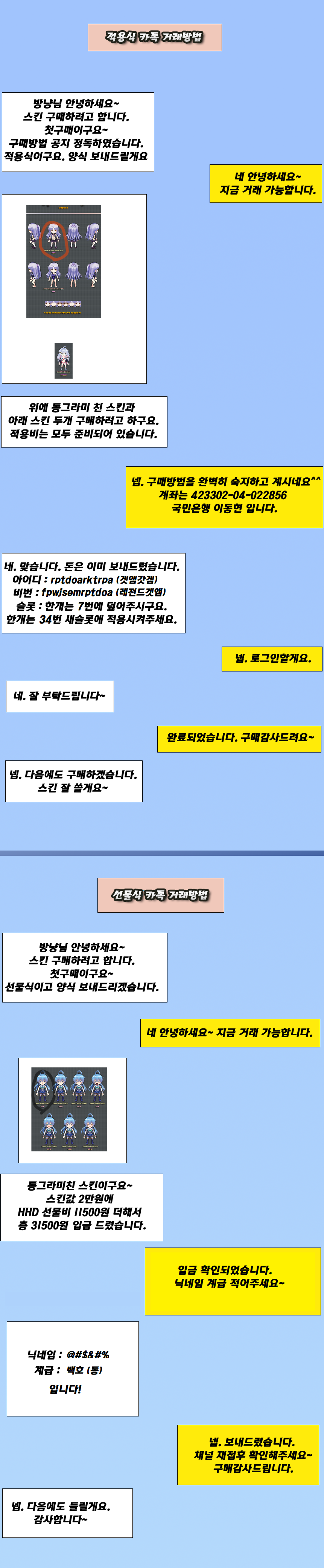 미리 입금하신 후 구매하실 스킨 사진들 또는 양식을 미리 카톡에 올려주시고